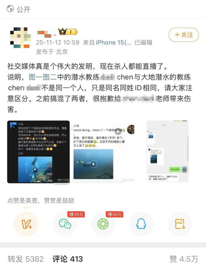 针对“涉事者为陈某某”的说法,记者注意到,社交媒体上有一家自由潜水俱乐部的教练与该姓名一致。11月13日,记者联系到这位陈教练,对方第一时间作出澄清:“近期已经有很多网友来问我这件事,但我不是涉事者,也根本不认识这个人,对事件发生的地点、经过等细节都一无所知,只是恰好同名而已,希望网友们不要再‘误伤’。”